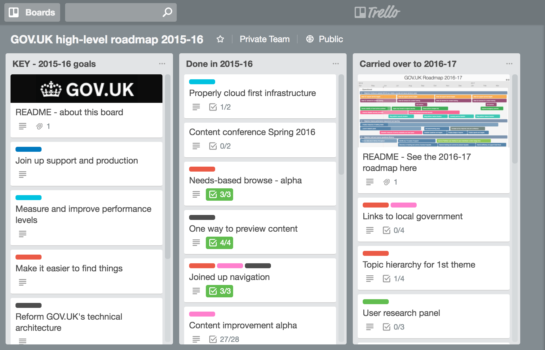 But, most devs and dev teams I’ve worked with like to map projects out with Trello or Pivotal Tracker. Like this one from the UK Government: