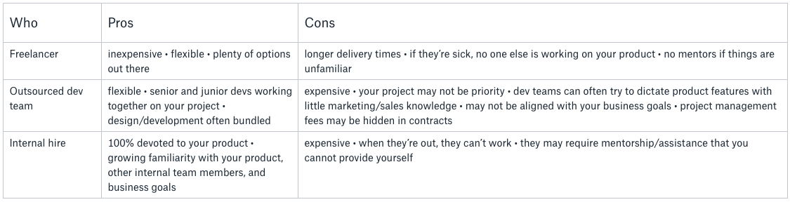 As my grandma would say, there’s pros and cons to everything honey. And that’s certainly true when deciding whether to outsource, hire a freelancer, or internal developer(s). We put together the following pros vs. cons chart.