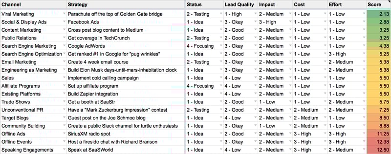 After you’ve got at least a few dozen strategies, next up is to prioritize them. Almost all companies are strapped for resources in one way or another: team size, time, money…usually combination of all those things. You certainly can’t tackle every one of these ideas at the same time, so prioritizing what to do first is crucial.