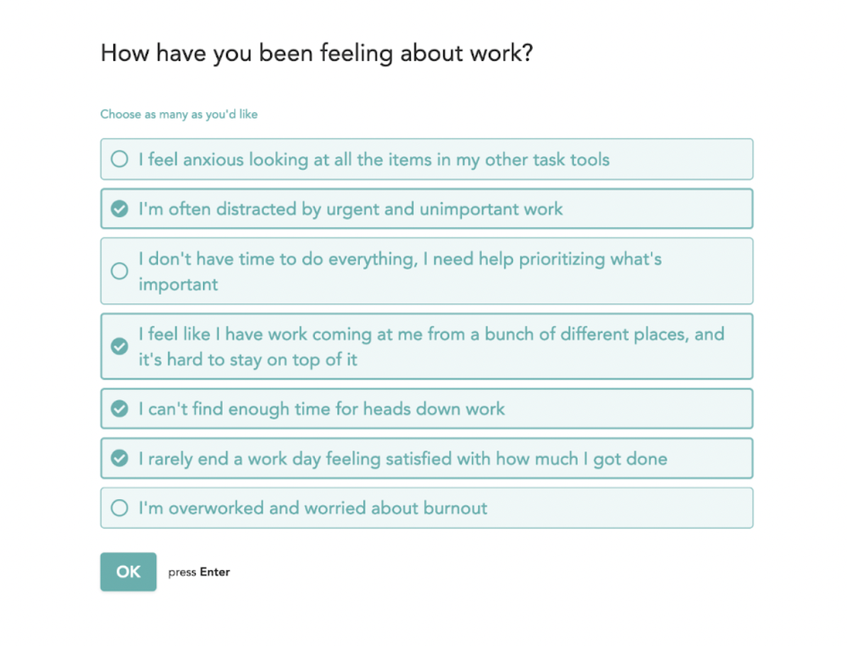 Ashutosh Priyadarshy, founder of Sunsama, swears by their onboarding questionnaire. It helps them qualify their customers, set expectations, and gets them into the right mindset. In addition to some fact-checking, they include sales-driven questions like these: