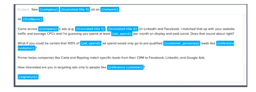 As you can see, this cold email pulls information about the prospect’s company size, ad spend, and top customers, to create a highly customized approach. Sprinkle in some common pain points and bold promises – that’s powerful!