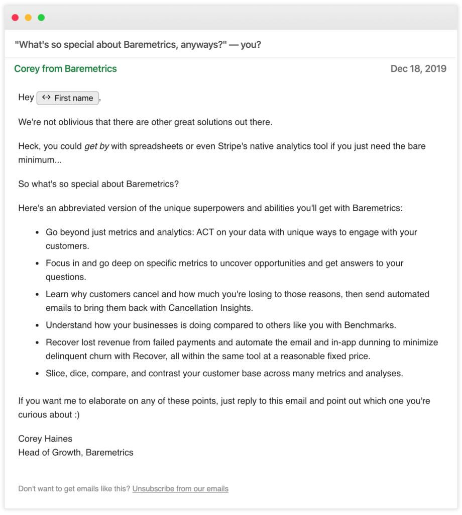 Here are two examples of these different kinds of emails we send for Baremetrics.