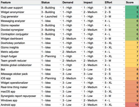 Whenever you’ve got a feature idea, before you throw it at your team and tell everyone to start hacking away right now, put the idea in to the feature spreadsheet to give yourself a dose of reality.