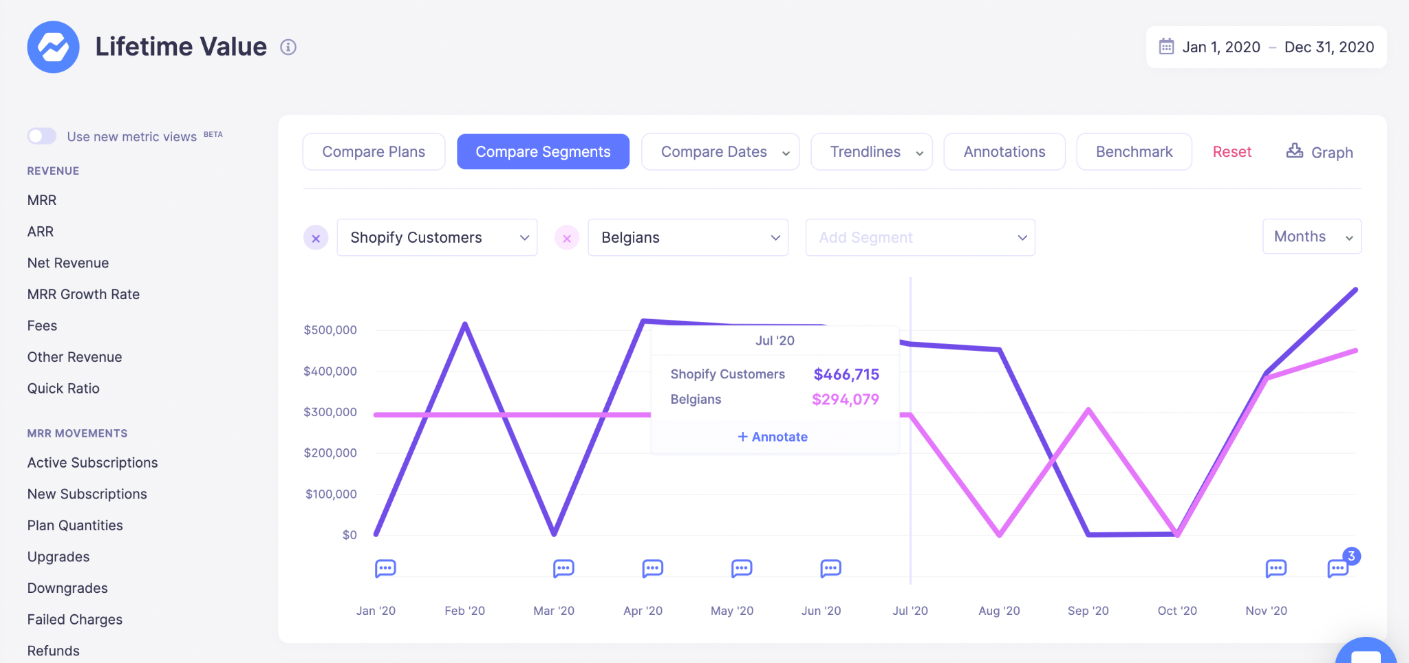 For example, it is important to understand the variation in your LTV based on different segments of your customers, such as shop age, location, average price point, service tier subscribed to, etc. This is something that Baremetrics can do automatically.