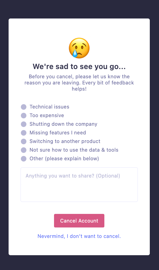 This quick survey prompts your customer to choose a reason for why they’re leaving, and appears via in-app widget or email, depending on your cancellation process.