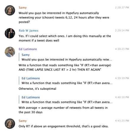After that initial beta group of about 10 people, Samy invited over 50 or so more people to try Hypefury. Twenty of those kept using the product so he knew he was on to something. Their word of mouth became a catalyst to get to our first 100 users.