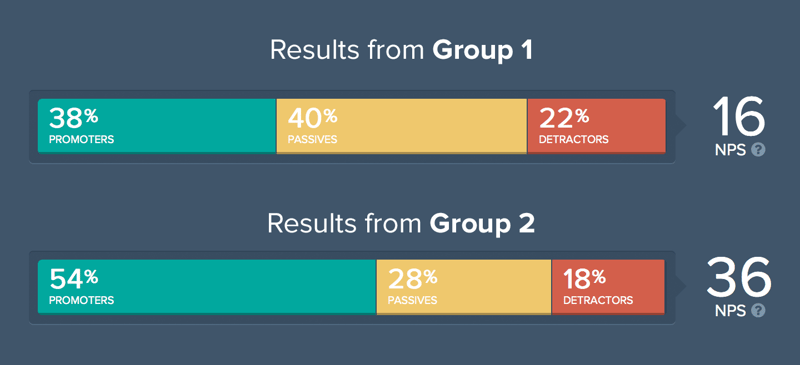 Our NPS score for the first group was 16, and 36 for the second. Neither number really means much. Technically, they’re considered “good” but what’s more important is the trend. As with any metric, a single, individual number isn’t all that useful, but the long term trend is what helps you make smart business decisions.