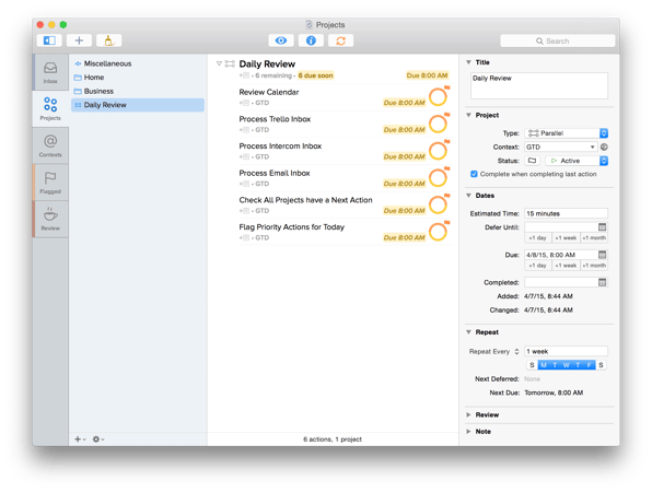 I have a Daily Review project set up that includes six items that I need to get done before anything else. I typically do them in order, but it’s not necessary (it’s set up as as Parallel project, FYI). I have a “GTD” context that I use just for this project.