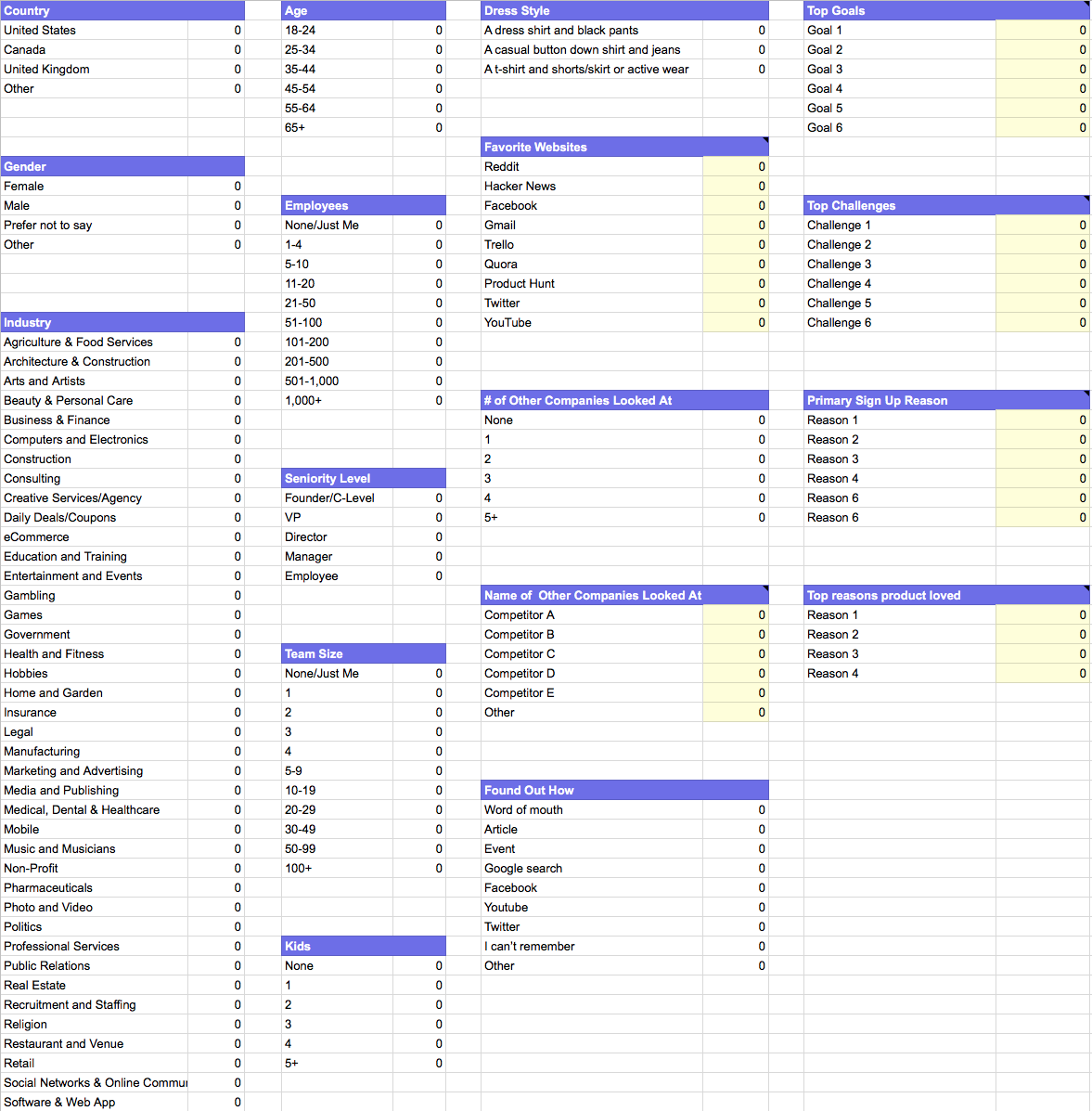 One tip on the top goals, challenges, signup reasons and things loved: you’ll need to distill these answers down. They’re free-form text fields on purpose. We don’t want to make assumptions about what customers want/need/love. But that does mean you’ll need to do a bit of work to summarize a lot of those responses in to a handful of items.