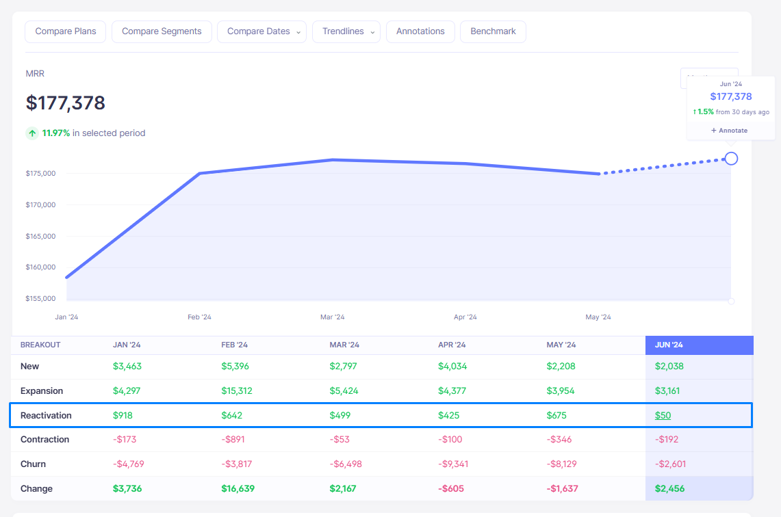 Reactivation MRR is the monthly recurring revenue generated from customers who were previously churned but returned during a given month. It shows the direct revenue impact of your winback efforts. -