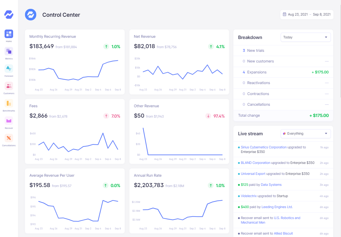 Determining your company’s revenue and net income is important since the foundation of any ecommerce business is analytics and reporting. These two categories contain the majority of the data that the company requires. Dashboards as well as metrics, and other sales-growing insights and tools, are also included with Baremetrics.