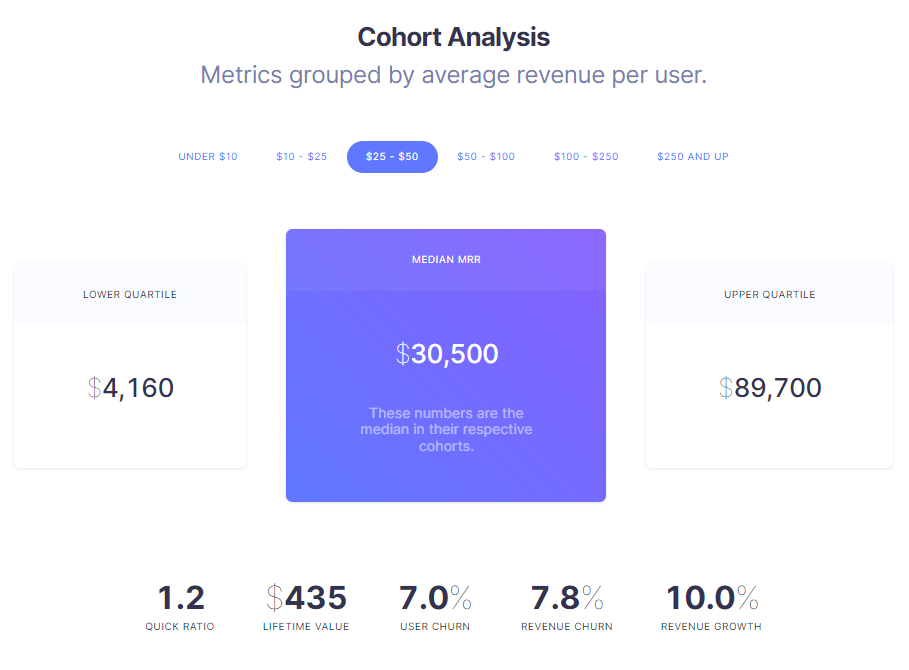 Here’s a quick breakdown of SaaS financial benchmarks for companies with $25-$50 average revenue per user (ARPU):