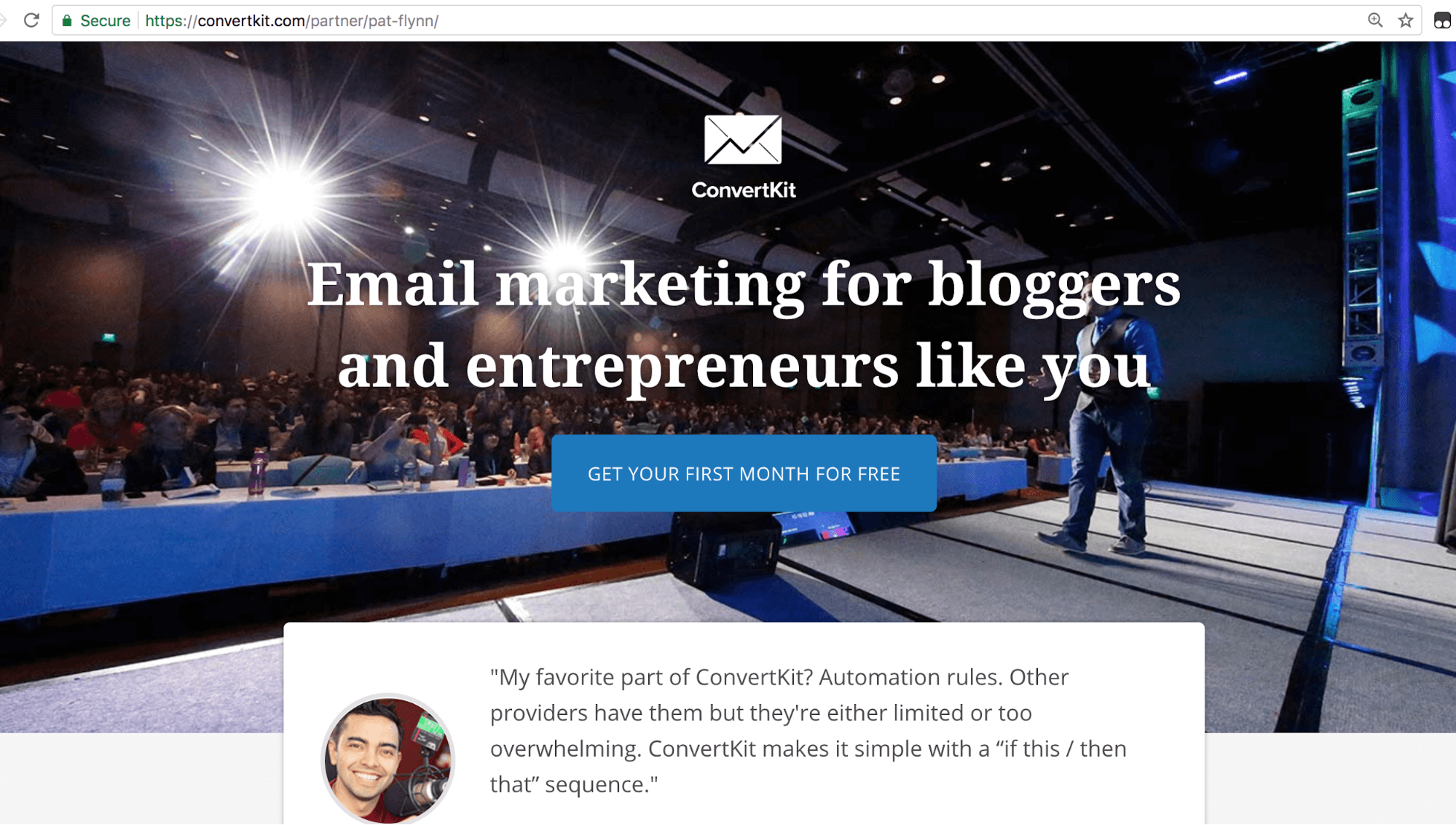 The savvy people at ConvertKit know that Pat’s audience is fiercely loyal. What kind of impact do you think a personalized landing page has, featuring a testimonial from Pat talking about how awesome ConvertKit is?