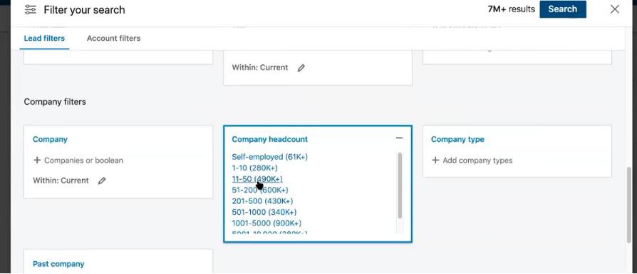 Let’s say your ICP is a web developer running a startup on the East Coast. Using Sales Navigator’s search engine, you can filter results by plugging in various titles, locations, industries, company headcounts, and so on, to come as close as you can to your ICPs.