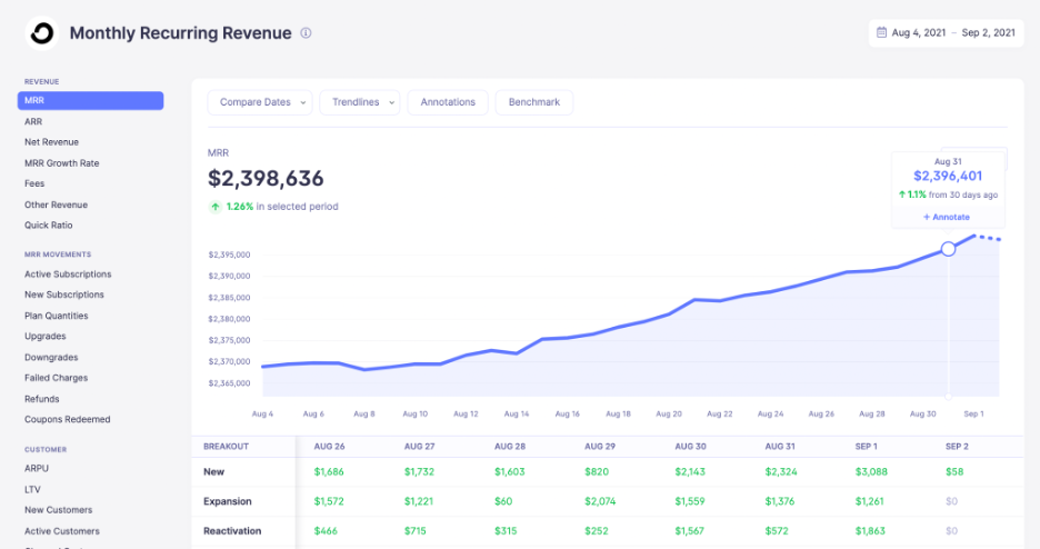 Manually tracking new customers, upgrades, and lost customers is considerably challenging, especially if you offer customization or usage-based billing. So, it’s a good idea to use a recurring revenue analytics tool so you can actually see how much money you’re making.