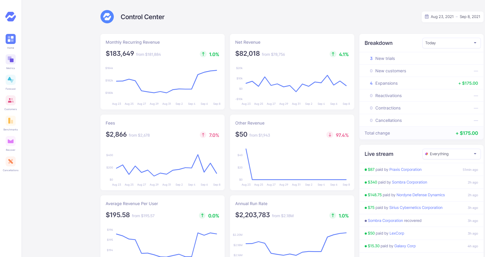 Baremetricsは、ビジネスのダッシュボードとして機能するビジネスメトリック監視ツールです。Baremetricsダッシュボードで、MRR、ARR、LTV、総顧客などを直接確認できます。こちらのデモアカウントをご覧ください。Baremetricsは、価格設定の実験が収益にどのように影響するかを分析するのに役立ちます。