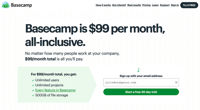 Basecampのコアバリュープロポジションの一部はシンプルさであり、それは価格設定に例示されています。定額の単一プラン、それが彼らの売り文句です。