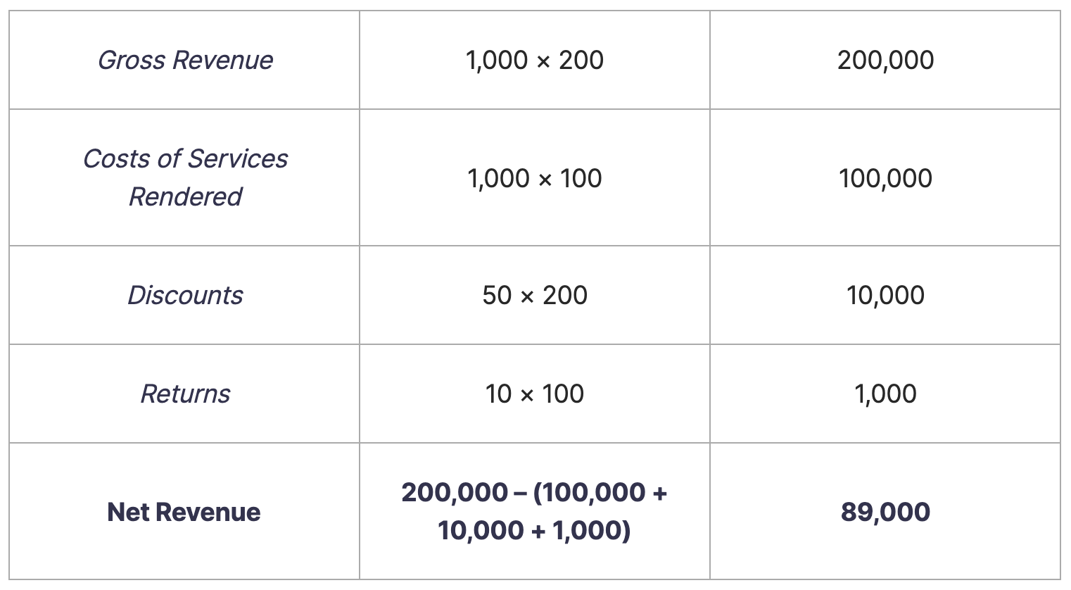 純収益(Net revenue)=200,000 – (10,000 + 1,000 + 100,000)